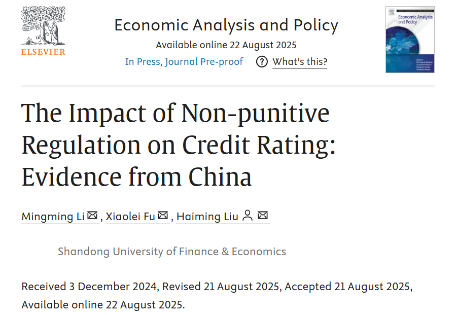 禁忌书屋 李明明副教授作为第一作者与其硕士研究生付晓蕾、教授刘海明合作撰写的论文《The Impact of Non-punitive Regulation on Credit Rating: Evidence from China》,于2025年8月在期刊《Economic Analysis and Policy》在线发表。该期刊最新影响因子为8.7,属我校A1类期刊。