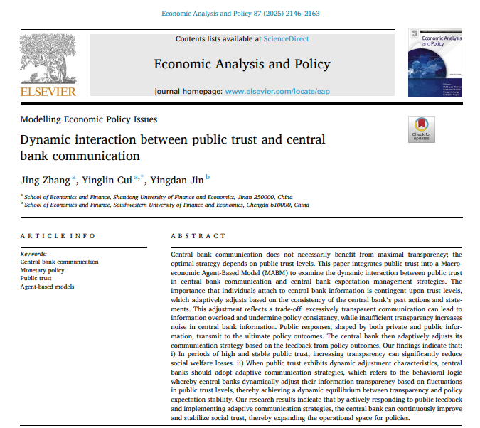禁忌书屋 张晶教授作为第一作者与博士研究生崔瑛麟(通讯作者)、硕士毕业生靳英丹(现为西南财大博士研究生)合作撰写的论文《Dynamic interaction between public trust and central bank communication》,于2025年9月在期刊《Economic Analysis and Policy》在线发表。该期刊最新影响因子为8.7,属我校A1类期刊。